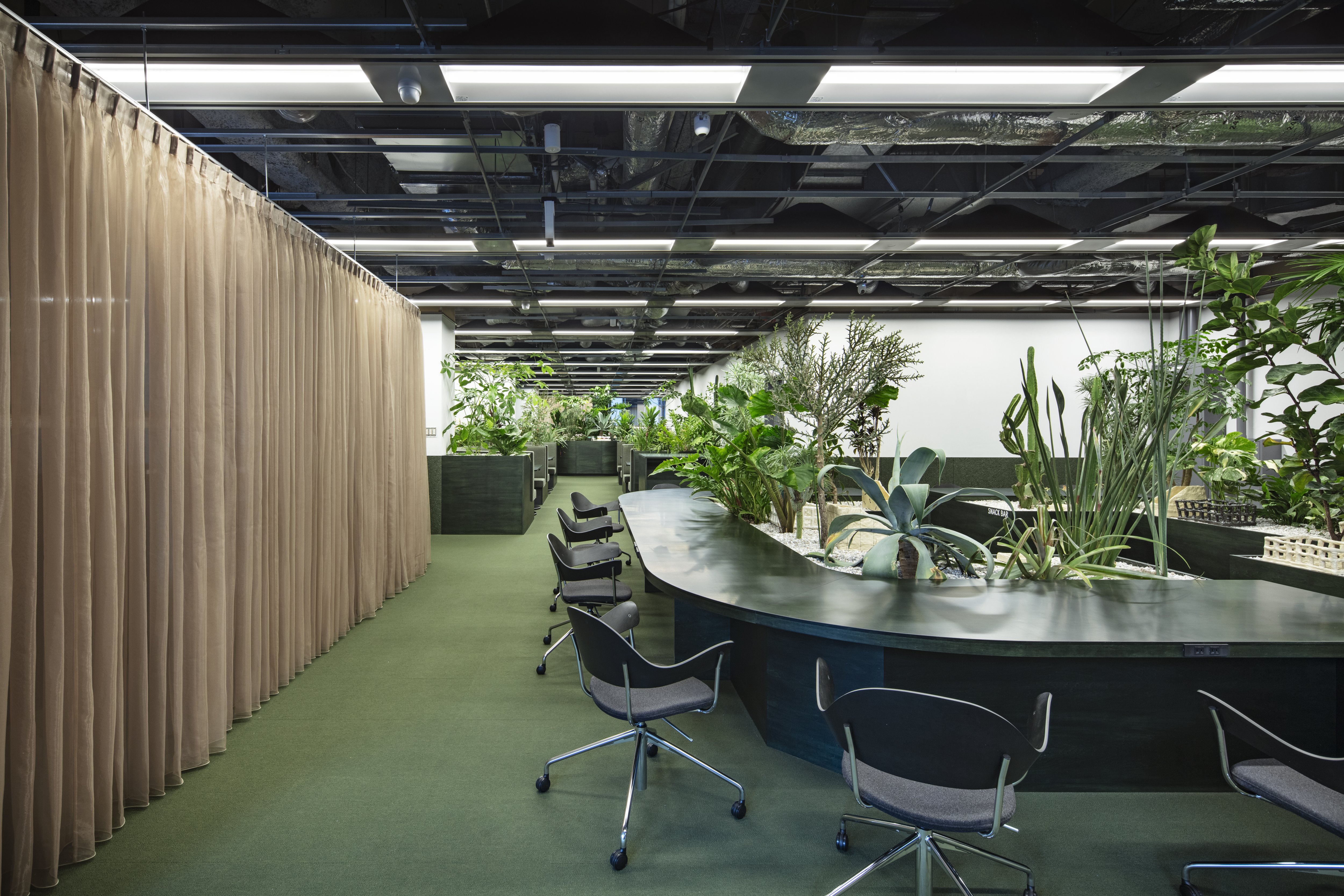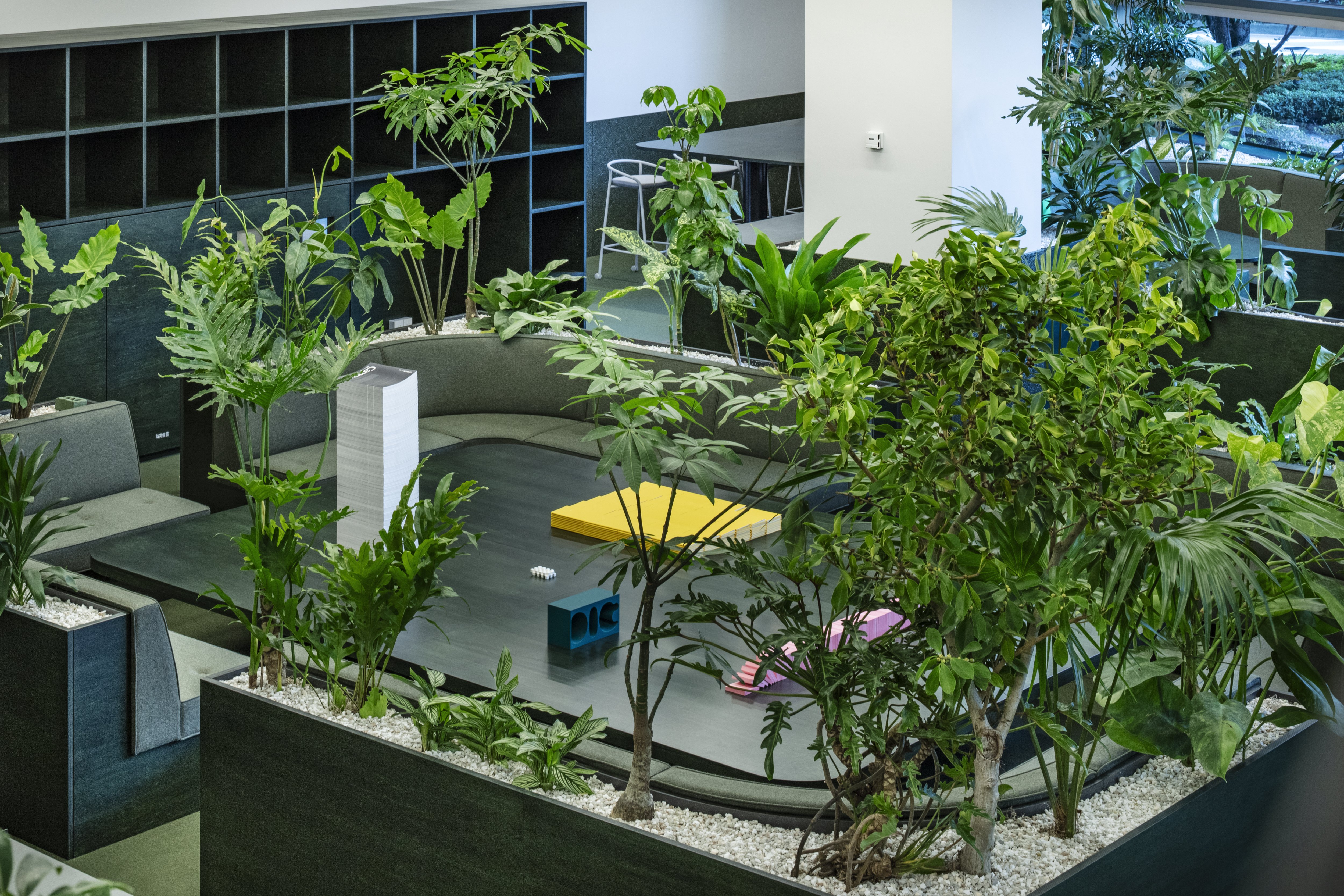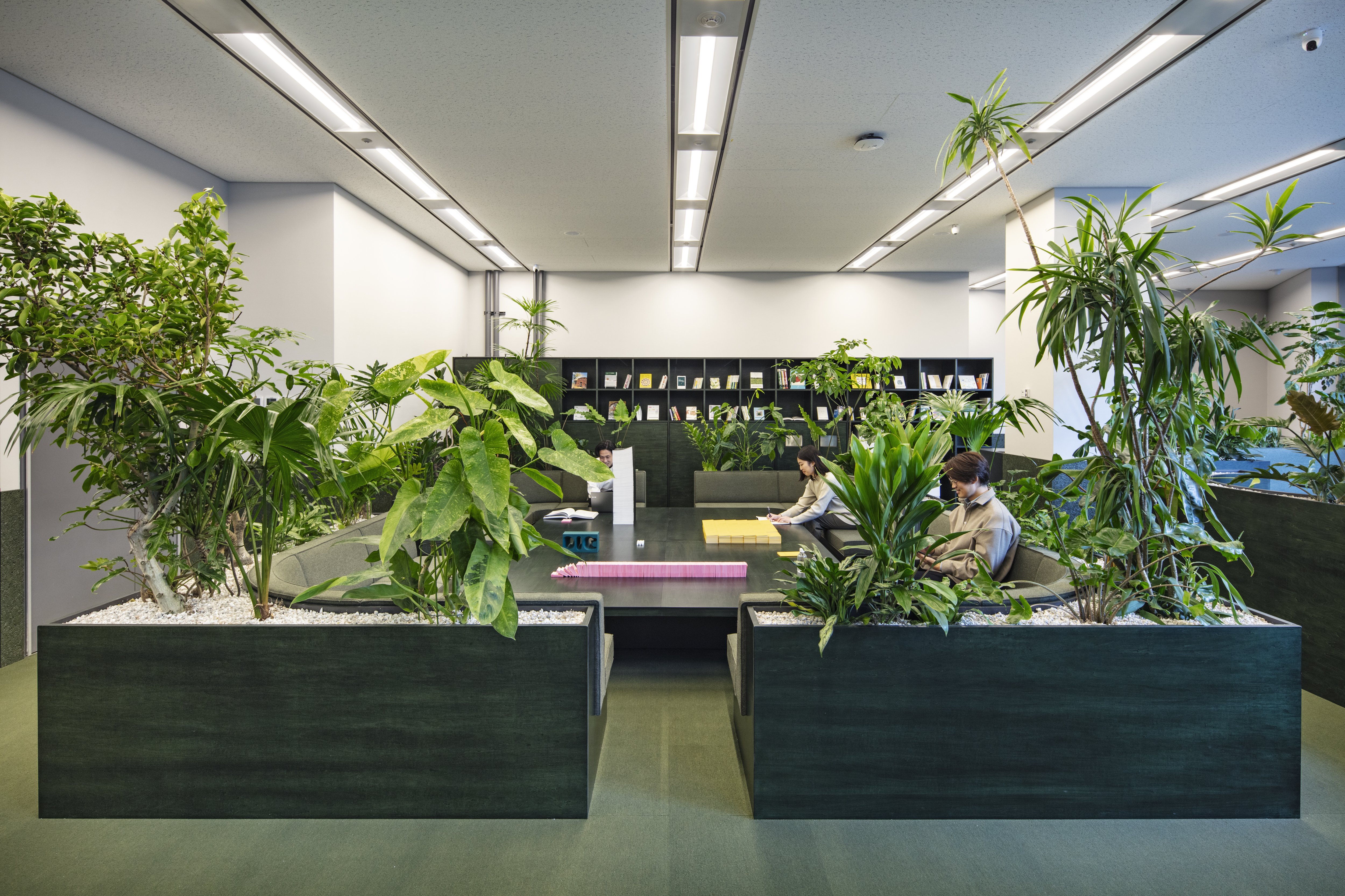 個人やチームの専有空間(=DISCOVER)と大きなワンルーム(=SHARE)となる空間的特徴がファミリーレストランのポテンシャルと解釈し空間を構築。活動に没入できるボックス席をメインに、ドリンクバーなどの目的地を点在させ、施設内を歩きまわることで、社員が周囲の活動から様々な刺激を受ける計画となっている。植栽やサイン計画では探究活動によって自らの考えが輪郭を帯びていく変遷を表現。社員へ向けてのメッセージを散りばめた空間とした。