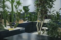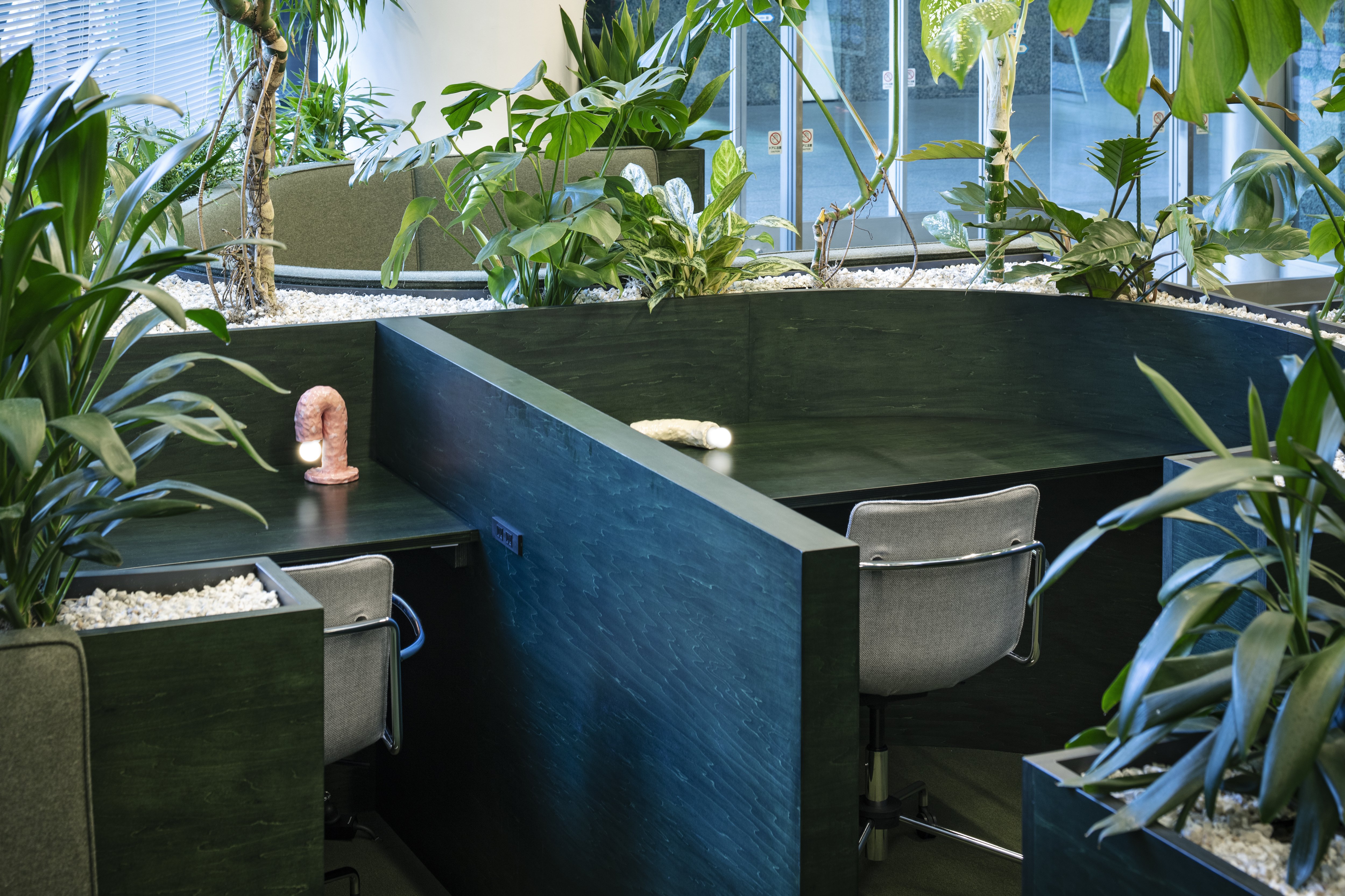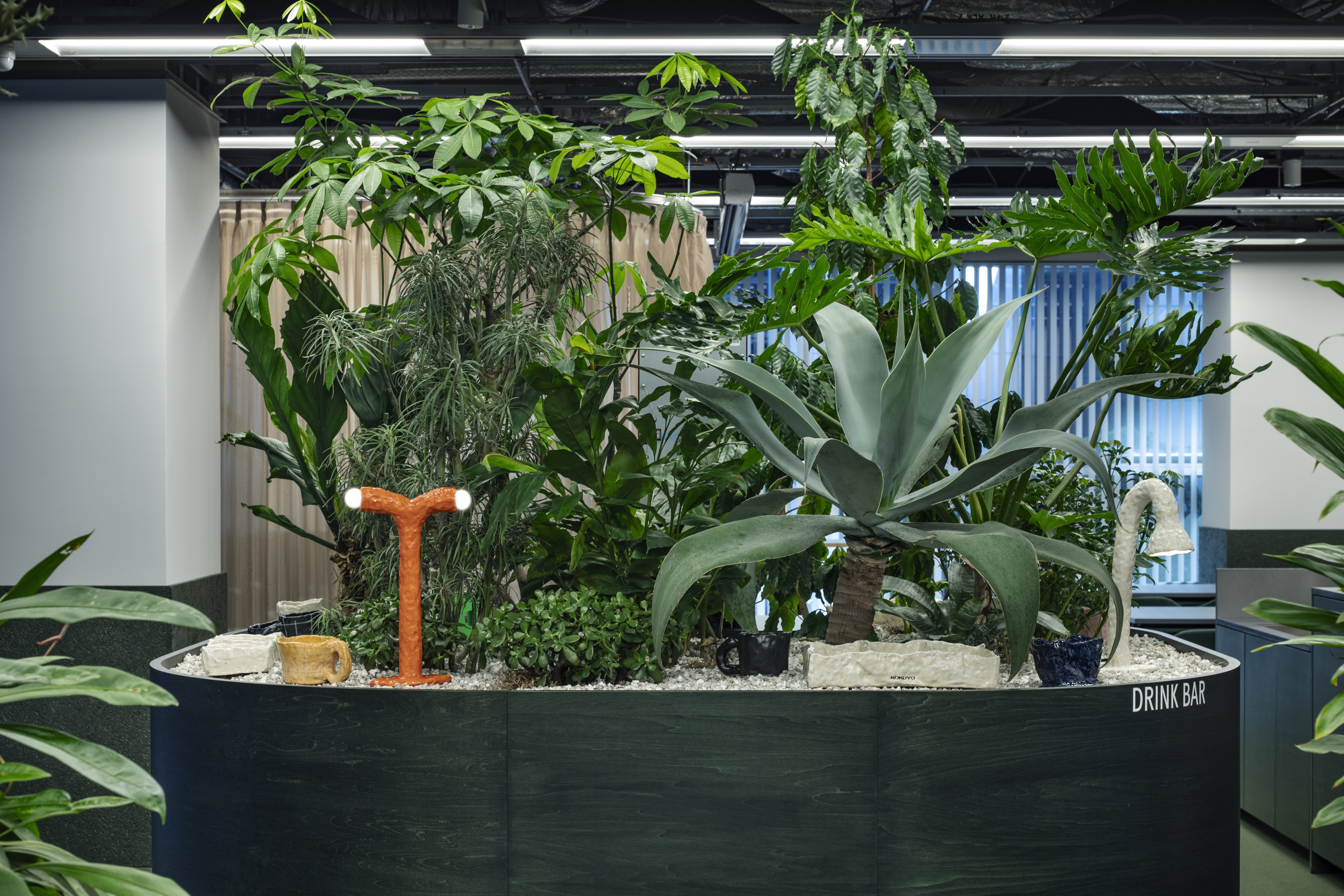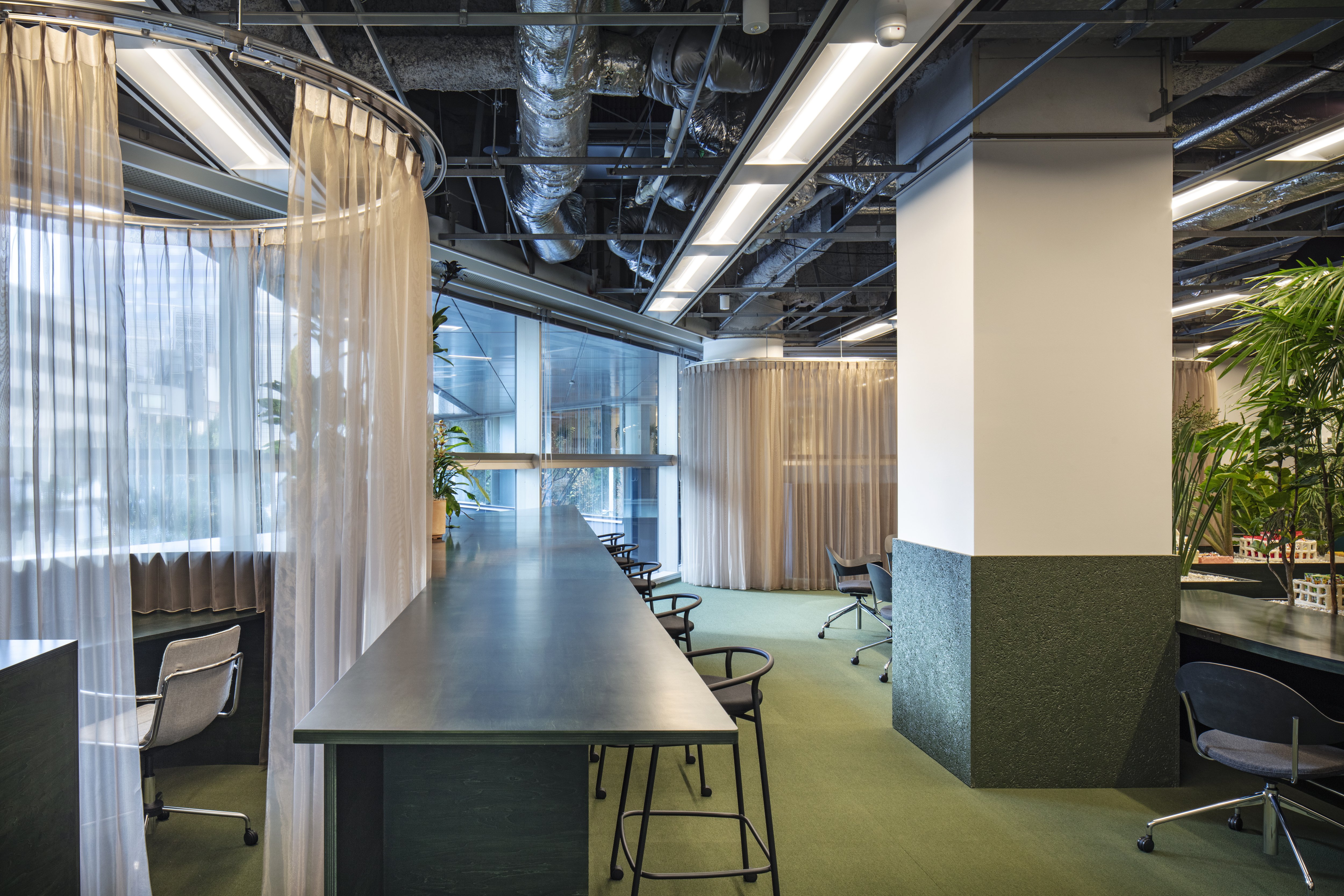 個人やチームの専有空間(=DISCOVER)と大きなワンルーム(=SHARE)となる空間的特徴がファミリーレストランのポテンシャルと解釈し空間を構築。活動に没入できるボックス席をメインに、ドリンクバーなどの目的地を点在させ、施設内を歩きまわることで、社員が周囲の活動から様々な刺激を受ける計画となっている。植栽やサイン計画では探究活動によって自らの考えが輪郭を帯びていく変遷を表現。社員へ向けてのメッセージを散りばめた空間とした。