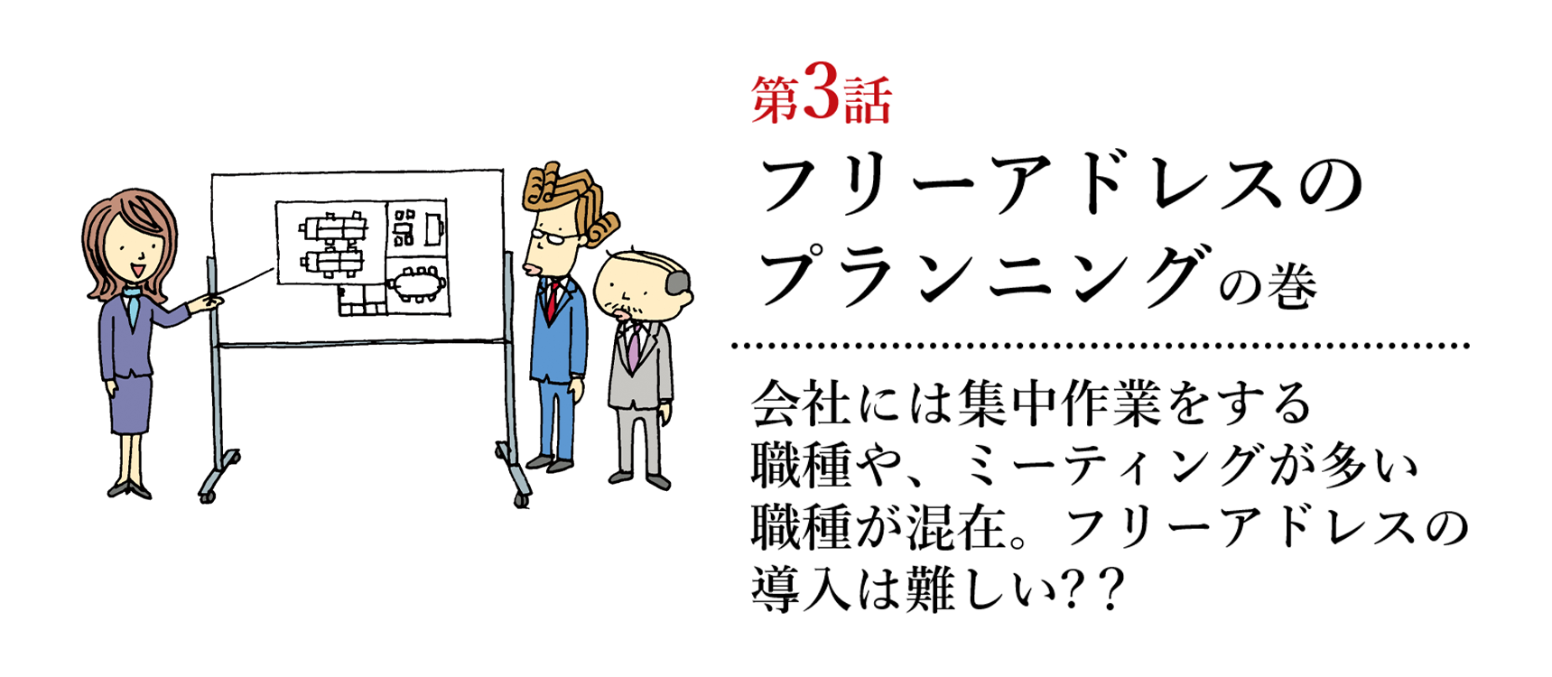 働き方改革に役立つオフィス家具の選び方を、4コマ漫画でわかりやすく、楽しくご紹介します。フリーアドレス、会議空間、収納庫、間仕切り、オフィスラウンジの5つのカテゴリーでオフィスの作り方のコツを学びましょう。