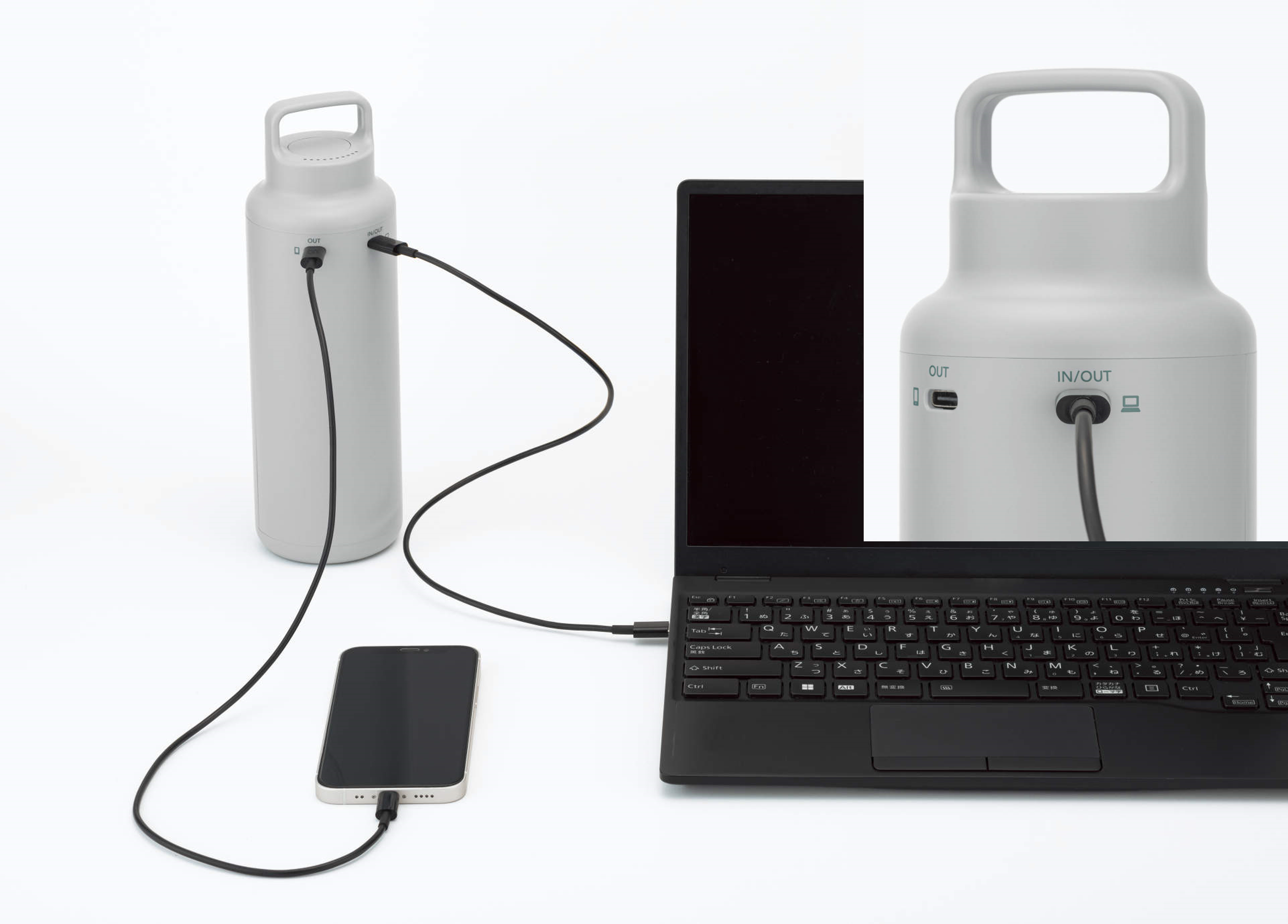 「Energy bottle(エナジーボトル)」は、コンパクトかつ軽量で高いモバイル性を兼ね備えたバッテリーです。500mlのペットボトルほどの大きさで、気軽に持ち運びできるサイズ感ですが、バッテリー容量は207.2whあり、65WのノートPCでほぼ終日使用できます。