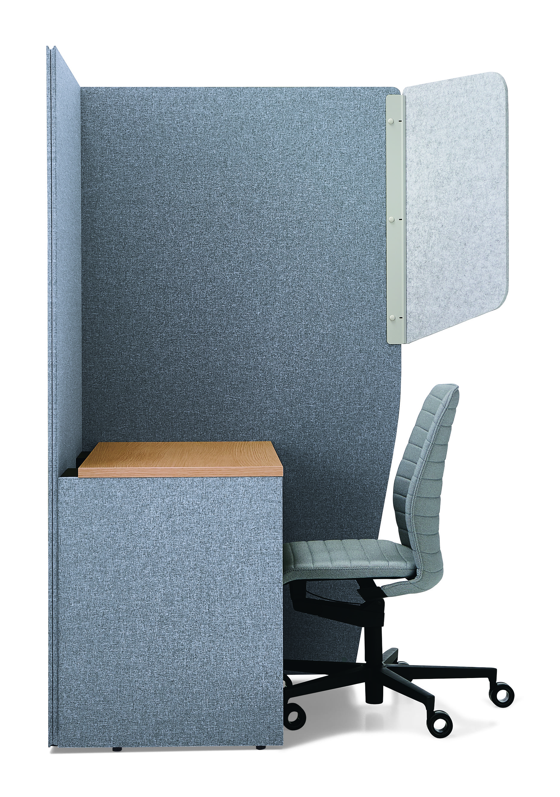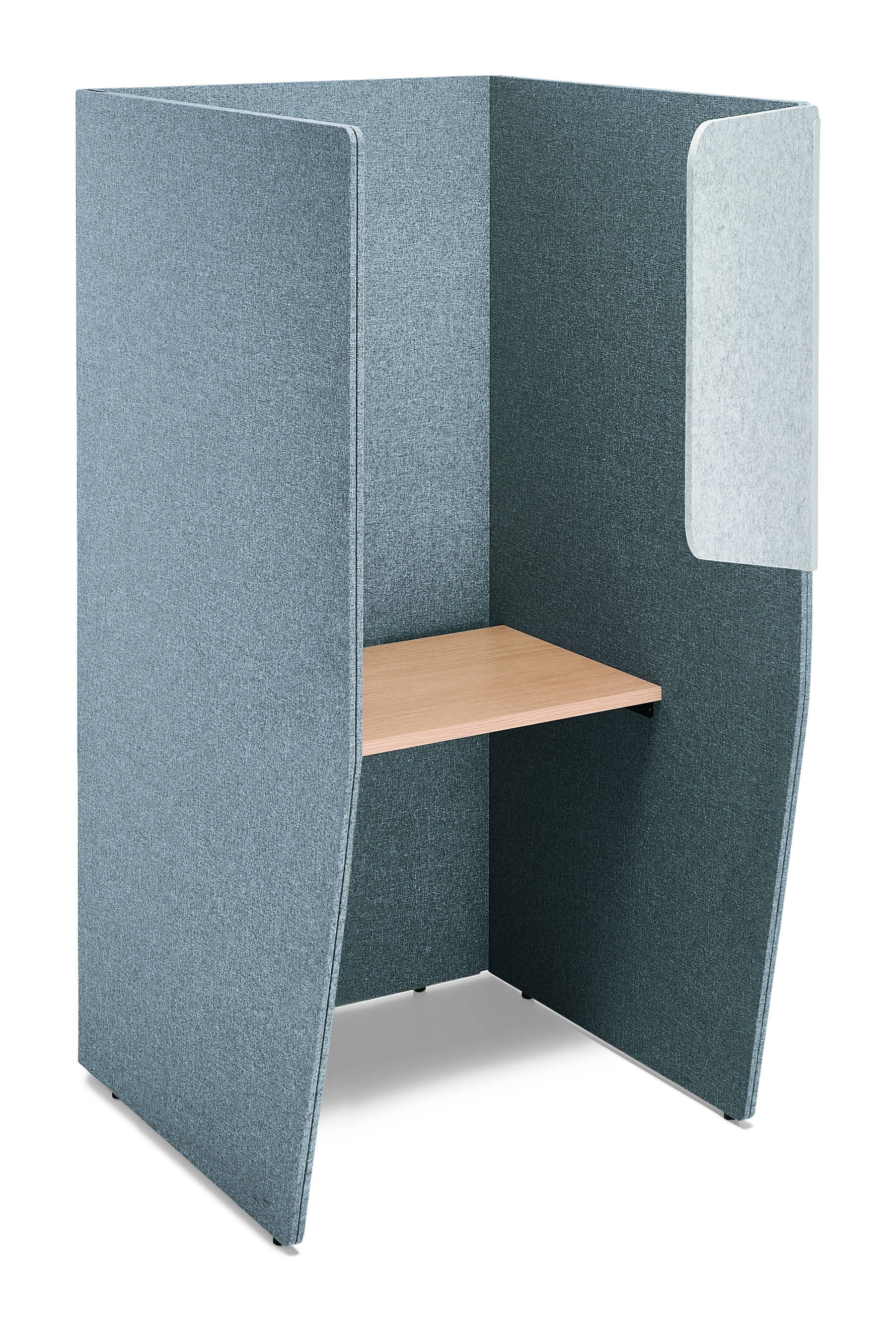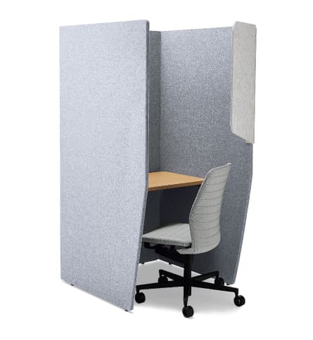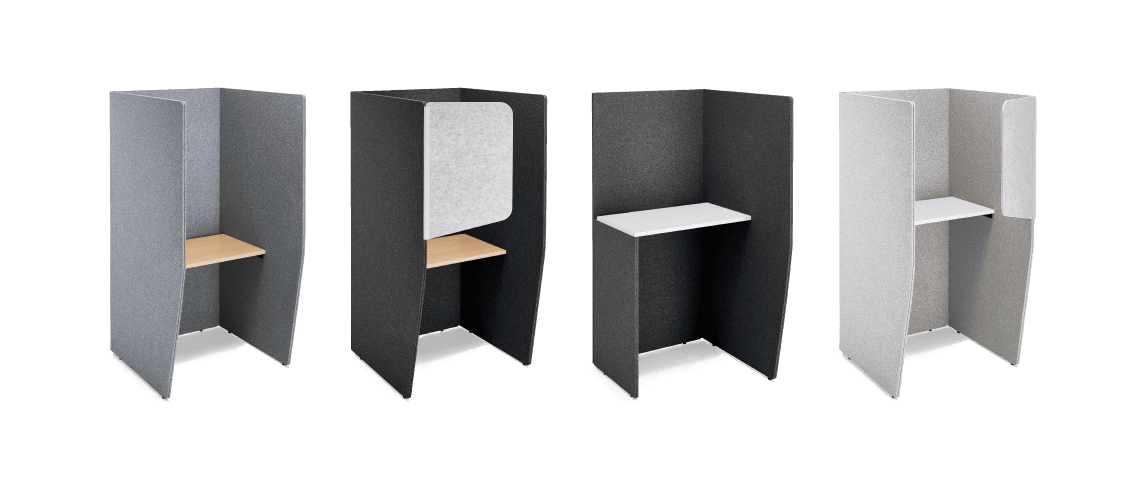 Panels for privacy and an optional back panel to sheild the view behind while in a web meeting. Available in two table heights to be used with an office chair or a high stool. Also available with a tablet tray (tablet stand) to be used for web meetings using a computer tablet or a smartphone.