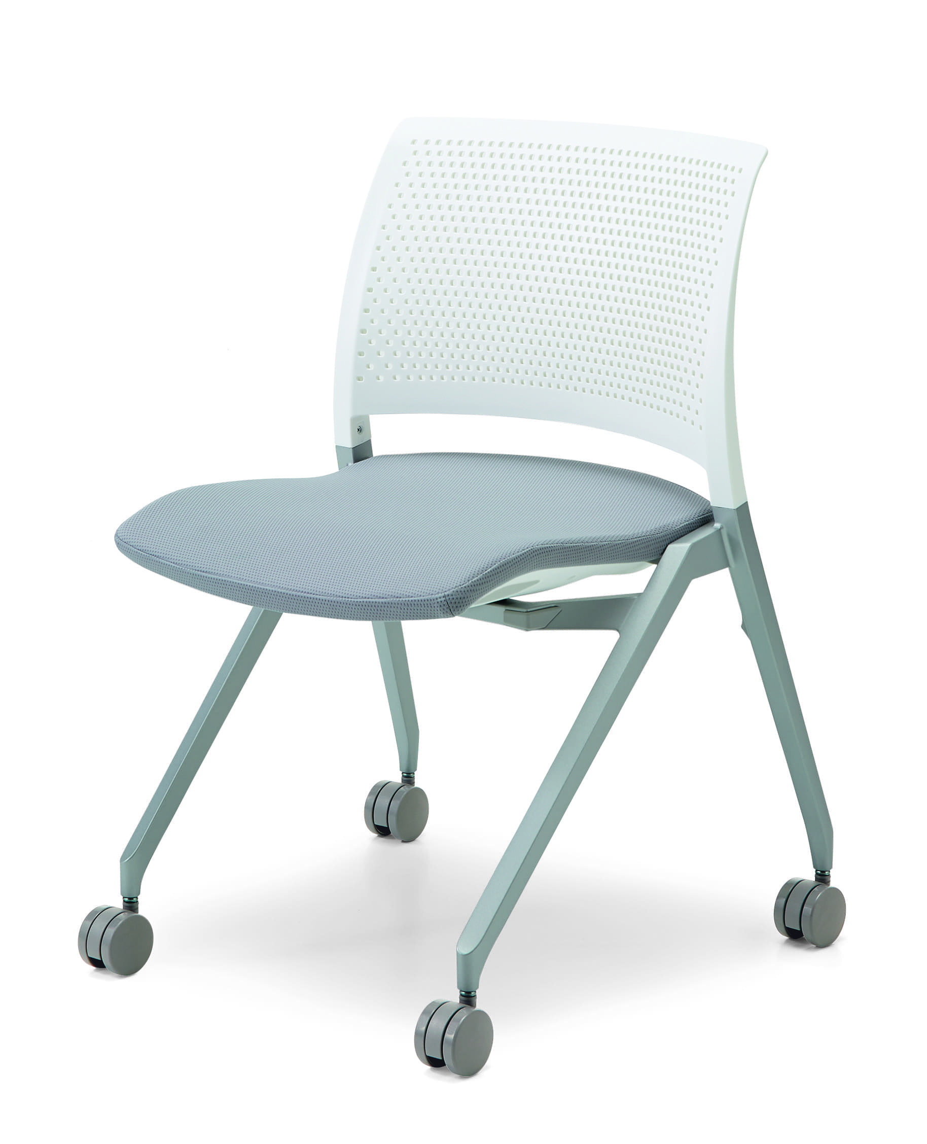 Poly backrest chair with a choice of seat finishes ideal for long-hour use. Structural components made from recycled fishing nets and reclaimed automobile car battery cases.