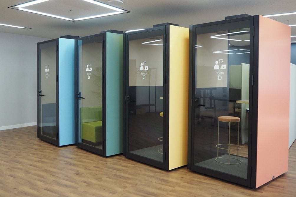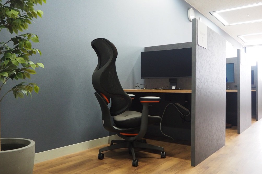 空間づくりにおいてこだわったのは、「ここに来る理由」を作ることでした。最新のハイスペック家具や、大型の湾曲モニター、Web会議などで使用できる個室用ブースなどを惜しみなく配置しています。