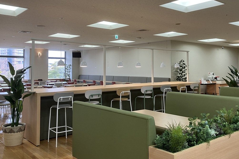 「いちよん」のオープンと時を同じくして、食堂も23年ぶりの全面リニューアルを遂げました。一人ひとりのスペースにゆとりを持たせたことで、ゆっくりと食事ができるようになりました。また、ランチタイム以外の時間は、誰もが利用でき、打ち合わせなどができるスペースとして、働き方改革の推進への寄与にも期待しています。