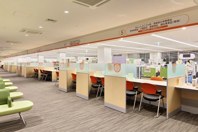 複数ある出入口のどこから入っても、利用者が迷わないように工夫しています。各窓口についている番号サインも、複数の方向から見やすいよう配慮しています。