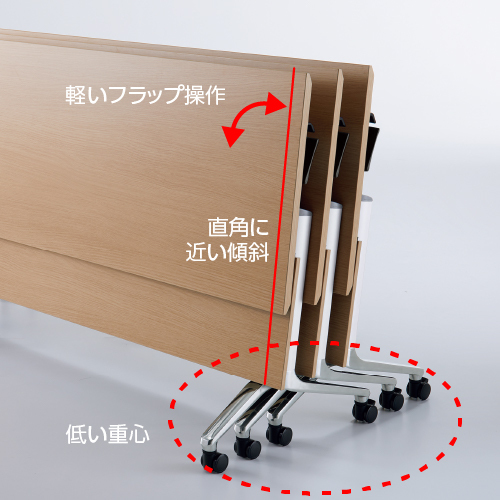 重量バランスの位置に天板回転軸があるため、非常に軽いフラップ操作性を実現。また、重心が低く、フラップした状態が直立に近いことから、安定かつ安全な走行ができます。