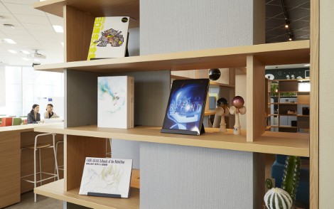 意外性や気づきを生むために、業務には直接関係のない本や玩具も置いています。ルービックキューブやけん玉など、手先や身体的運動によって発想につながるかもしれません。
