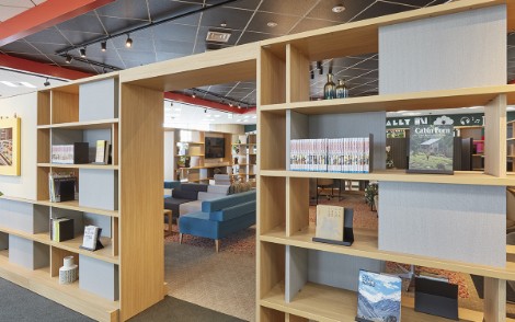 「LIVE-RALLY」の中央には、自社ゲームソフトや原作コミックを並べるためのウォールシェルフを設置。ゆるやかに空間を仕切っています。書籍・小物のセレクトは、オフィスの納入実績も多い青山ブックセンターに依頼しました。