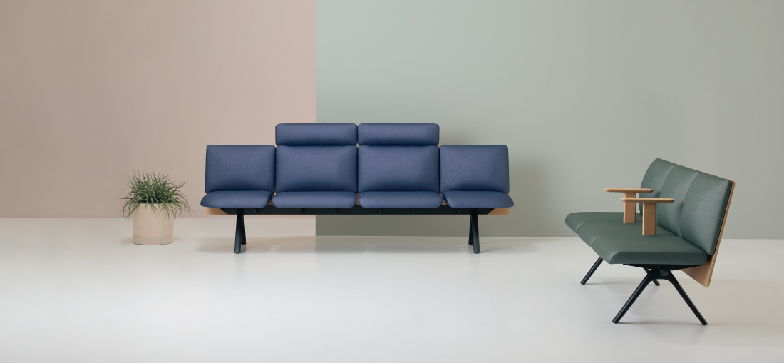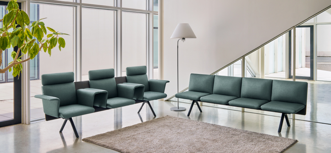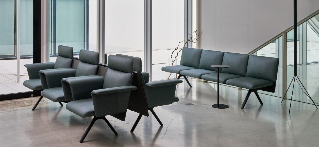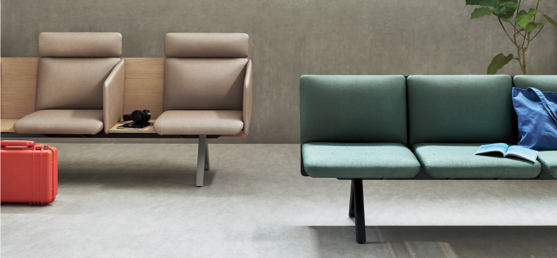 中央席は幅を広げたゆったり設計に、サイドの席は体の向きを変えやすいラウンド形状にすることで、中央席にも座りやすい効率的な着座を促します。他にも隣席との距離を保ち、よりゆったり過ごせるラインアップもあります。