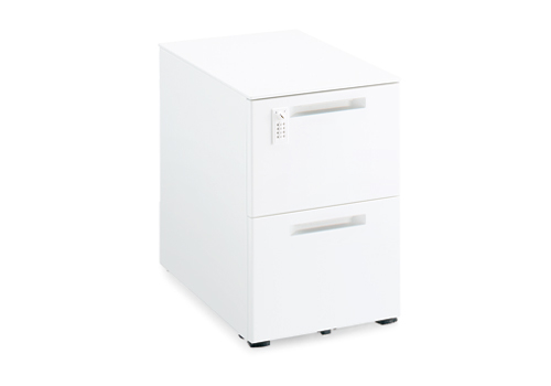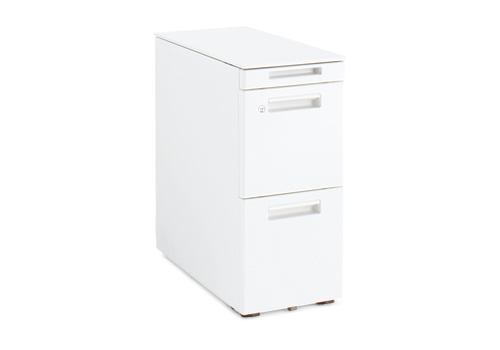 引き出しの容量を確保する薄型キャスターはロック機構付きで、自由な移動と安定感のある設置状態を実現します。