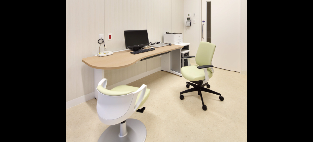 問診や説明のしやすさ、資料を置けるスペースにも配慮。デスク天板はR形状で患者さんに安心感を与えます。