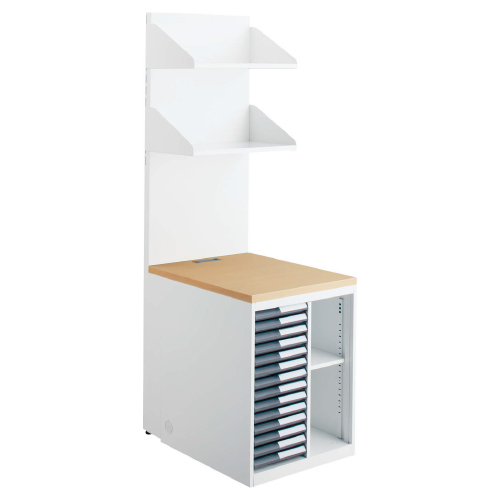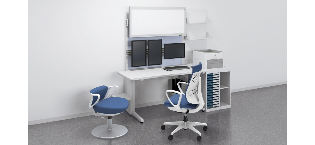 ハンギング用オプションや卓上トレー収納(別売)にも手が届きやすいデスクサイズで、無駄のない業務導線を実現します。