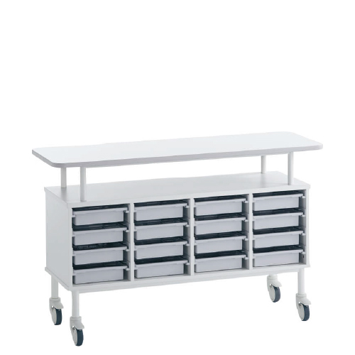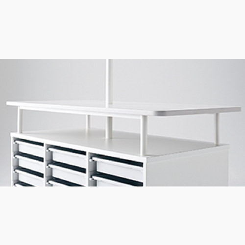 天板下によく使用する医療材料等を置くことができ、作業面を常に清潔に保てます。 トレーに入らないような大型のステンレスバット類も置くことができます。