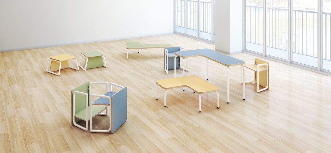 本体の向きや置き方を変えることで機能を変えて使うことができ、特徴的な形状により、多様なレイアウトを構成することができます。