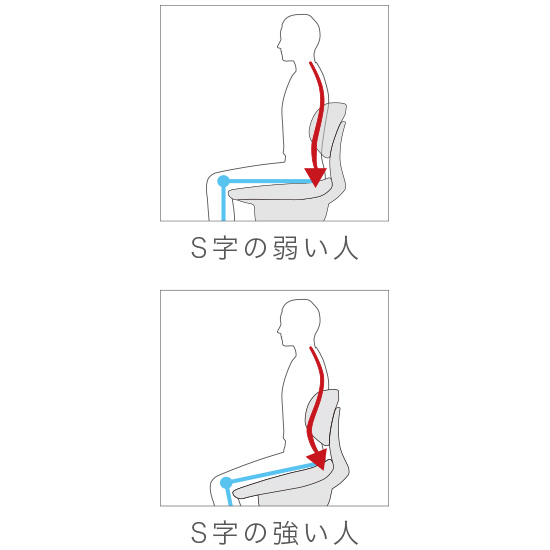 骨盤の角度によってつくられる自然な背骨のS字カーブ。ingは座面が自由に動くグライディング・メカにより、座った人の自然なS字を整えるため、ランバーサポートの調整を必要としません。