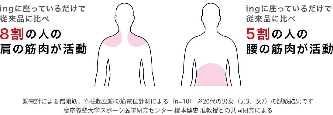 同じ姿勢をつづけることで、筋肉は緊張します。そのため、長時間座っていると肩や腰の痛みを感じることがあります。ingに座ることで引きだされる体の自然な動きは、肩や腰の筋肉を活動させることが実証されています。