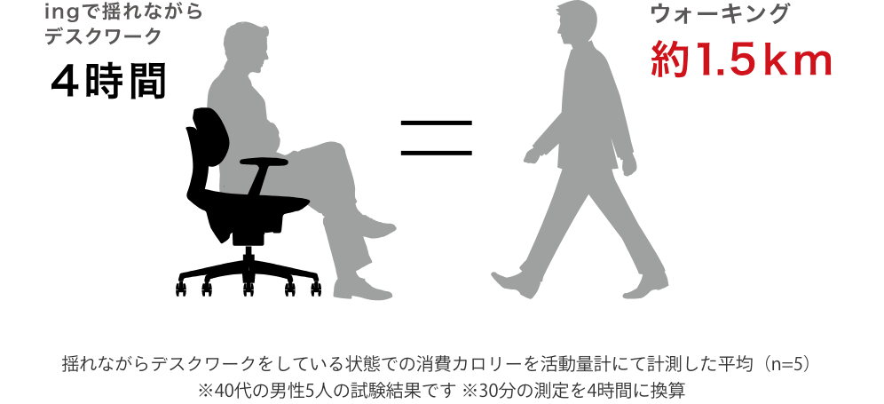 座っている状態で体の動きを引き出すingは、運動をしたときと同じ効果が期待できます。例えばカロリー消費量で比べると、ingに4時間座って揺れながらデスクワークしたときと、約1.5kmウォーキングしたときとが同等という結果がでています。