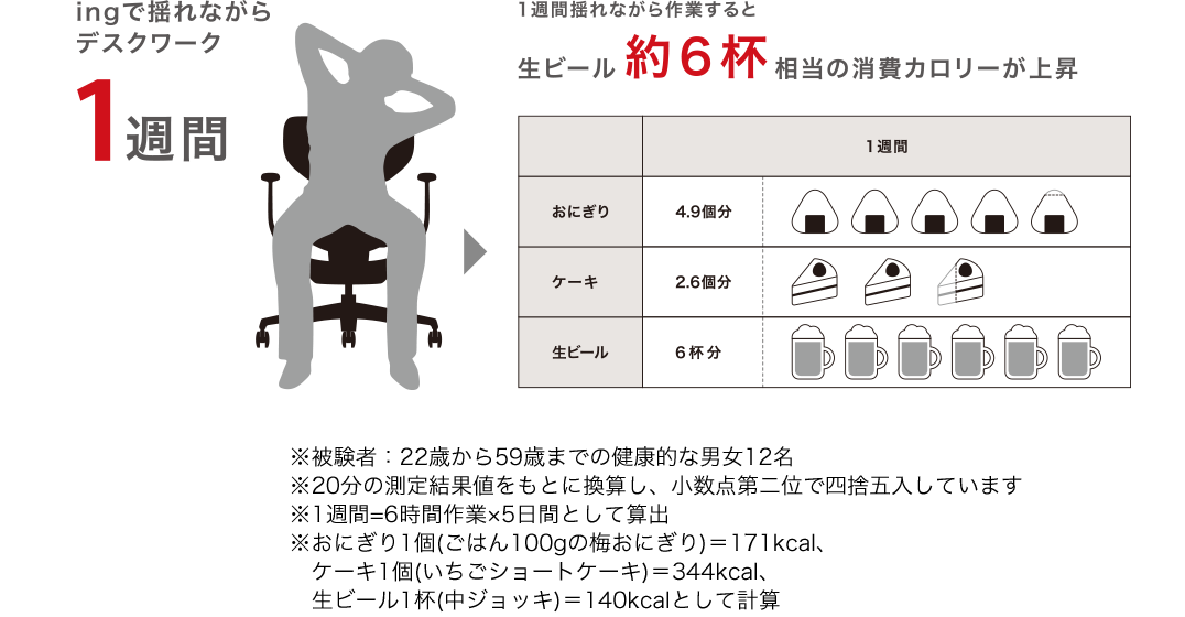 前後左右に適度な揺れが得られるingは、1週間座って揺れながらデスクワークをすると約840kcalが消費されます。その量、生ビール約6杯相当。運動をする時間のないワーカーがスリムになれる可能性が、ingにあります。