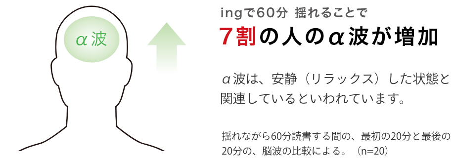 効率化やスピードが求められるビジネスシーンにおいて、リラックスできる環境を確保することが難しくなっています。ingなら、座りながら体を揺らすうちに、リラックス度を表すα波が増加。解放された思考がクリエイティビティを高めます。