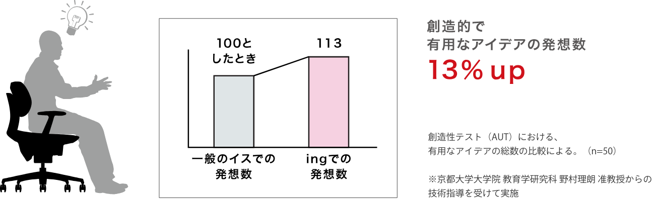 思考を巡らせるとき、歩いたり、脚を揺らしたりしますよね。一定のリズムで体を動かすことが創造性を高めるのかもしれません。ingは、座ったままでリズミカルな動きをとることが可能。有用性の高いアイデアが浮かびやすい状態をつくります。