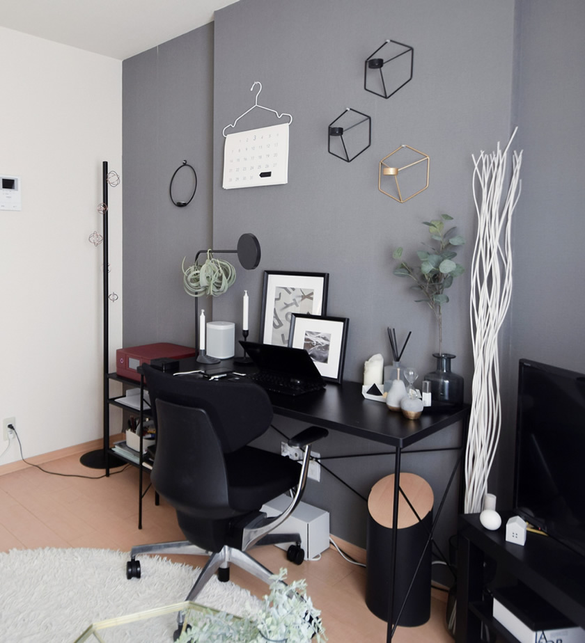『ing』は、ワンルームでもちょうどいいサイズ感です。私が選んだのは、本体、張り地が黒で、脚と肘がアルミのラテラルタイプです。モノトーンで、空間が締まる感じがあるので気に入っています。120×60センチの天板のデスクと組み合わせているのですが、ずっと座っていても苦になりません。ただ、オフィス用なので仕方がないのですが、脚が大きくてデスクの下に入りきらないのが気になります。また、イスの座面をロックしていないと、絨毯では少し引きにくい気がします。