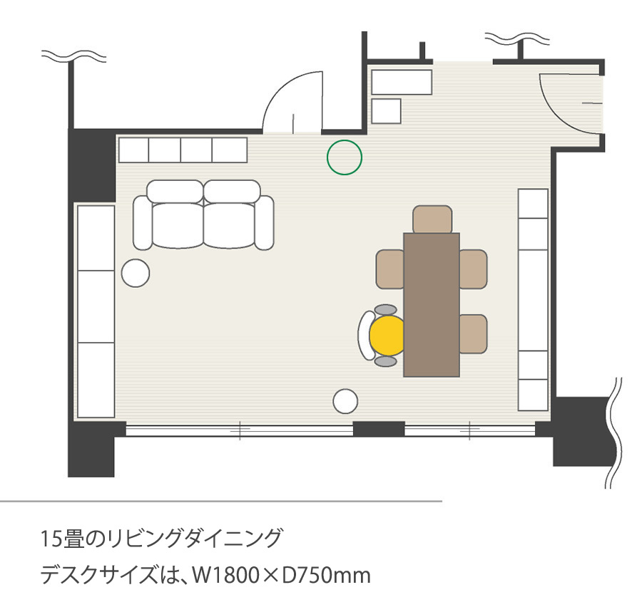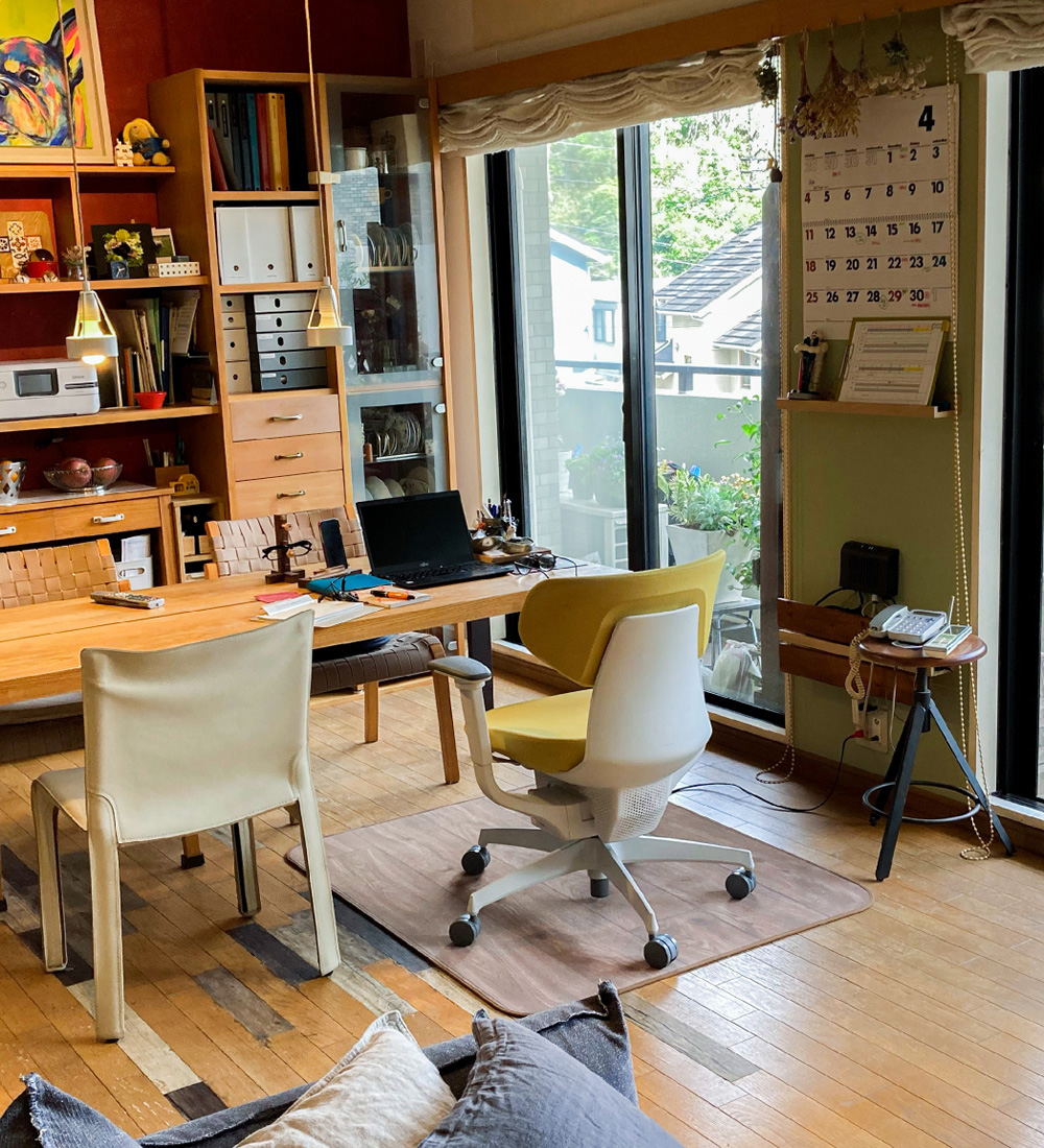 オフィスチェアーは、大きさや存在感が気になっていましたが、ダイニングに置いていても気になりません。ハイタイプにしなかったこともありますが、肘が可動式で不使用時に天板の下に納まるところは、重要なポイントだと思います。また、キャスターはフローリングにとって大敵なので、マットの使用をおすすめします。さまざまな種類がありますが、私はパイル調の毛足の短いマットにしています。足裏の感触が気持ちよく、おすすめです。