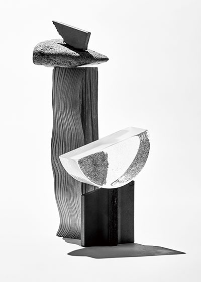 人智の及ばぬものとして自然への畏怖を感じながらも、同時に敬意を払い続ける。人と対立するものではなく、地続きの存在として認め、糧とする。土や石、木、水など素の造形に固有の美学を見出すとともに、人工的な美感を尊び、その間を振り子のように行きつ戻りつするなかに「箱庭」に見出される豊かさのグラデーション。自然と人工、落ち着きと刺激、日常と非日常の全てを否定することなく、愛する大らかさを有する空間家具。