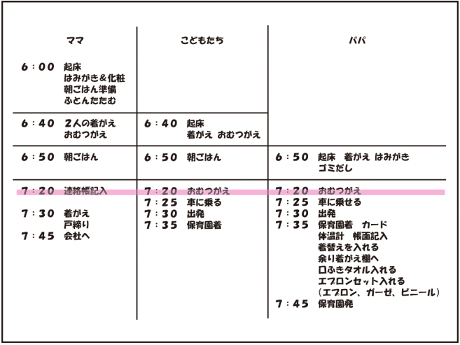 それから、一番忙しい朝起きてから出かけるまでの家族タイムテーブルをつくってみました。自分の支度だけ整っても主人の準備ができていなければ意味がないので。 - ――それはいいアイデアですね!具体的に書いてみると、どんな毎日になるのか見えやすいですね。