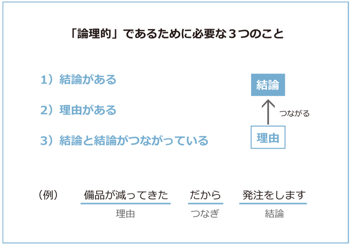 論理的に話すために必要なポイントは3つあります。話の「結論」、その結論に至った「理由」、そして結論と理由の「つながり」の3つです。論理的に話せる人は必ず、この3つのポイントを押さえて話しています。逆に言うと、3つのうち1つでも欠けている要素があると論理的な話は成立しません。