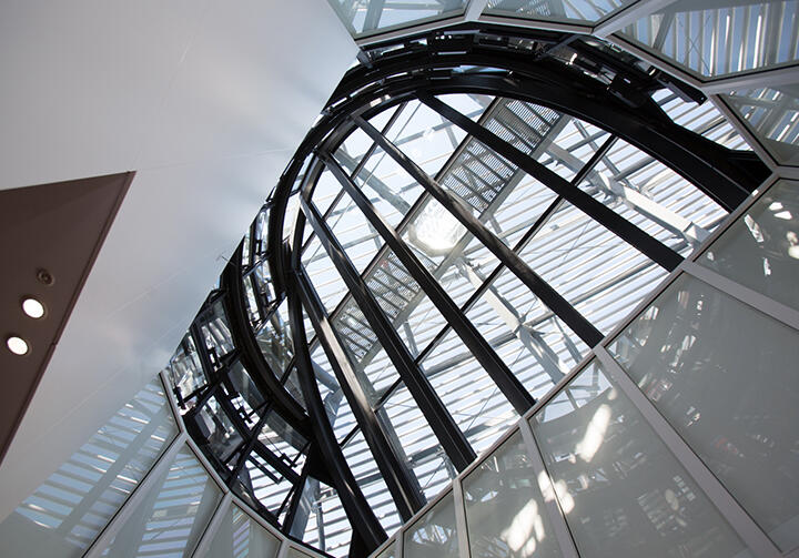 デザインだけでなく、各フロアから取り込んだ外気を屋上へと抜けさせる自然換気のシステムや、上部には太陽光追尾装置も備わっており、この螺旋階段はオフィスの象徴であると同時に省エネにも一役買っている。さらに、階段を取り巻く壁はガラス張りで各フロアの様子が一目で見渡すことができるため、社員同士の円滑なコミュニケーションにもつながっている。