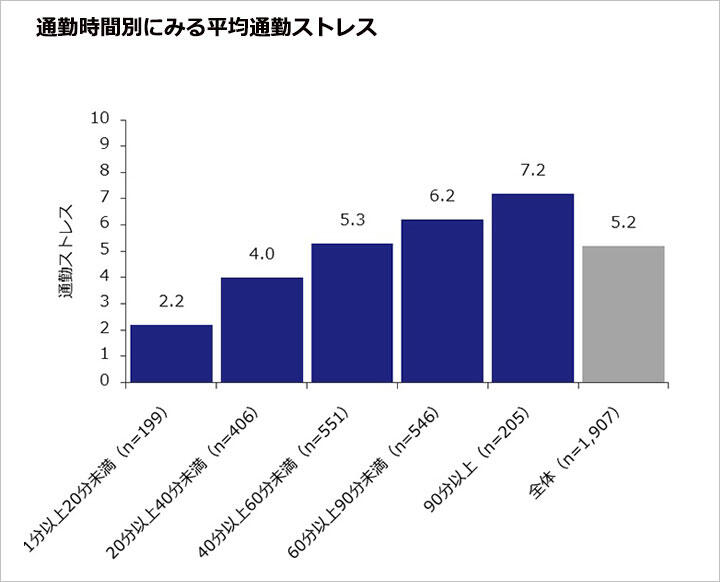 通勤ストレスを0(最低)~10(最高)の11段階で聞くと、通勤時間が長くなればなるほど、通勤ストレス値が高くなるという調査結果が出ている。長時間かけて移動するストレスに加え、首都圏では満員電車に乗って過酷な通勤に耐えなければならない人も多いため、通勤するだけで疲れてしまうという人も少なくない。