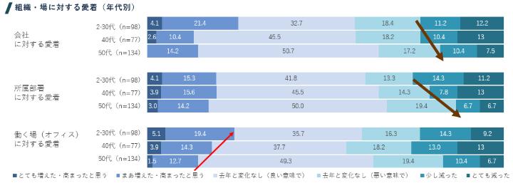 「会社」「所属する部署」「働く場(オフィス)」に対するワーカーの愛着についてさらに詳しく考察するために、回答を年代別に再集計してみました。