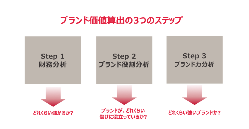 上條:ブランド価値は、「企業価値」の中で「無形資産」に含まれるものです。そして、無形資産のうちブランド価値が占める割合は非常に多く、ブランドによっては約6割に達するブランドもあります。その算出方法ですが、インターブランドでは、そのブランドが「将来、どれくらい儲かるか(財務分析)」、「儲けのうちブランドがどれくらい役立っているか(ブランドの役割分析)」、「どれくらい強いブランドか(ブランド力分析)」の3ステップで算出しています。