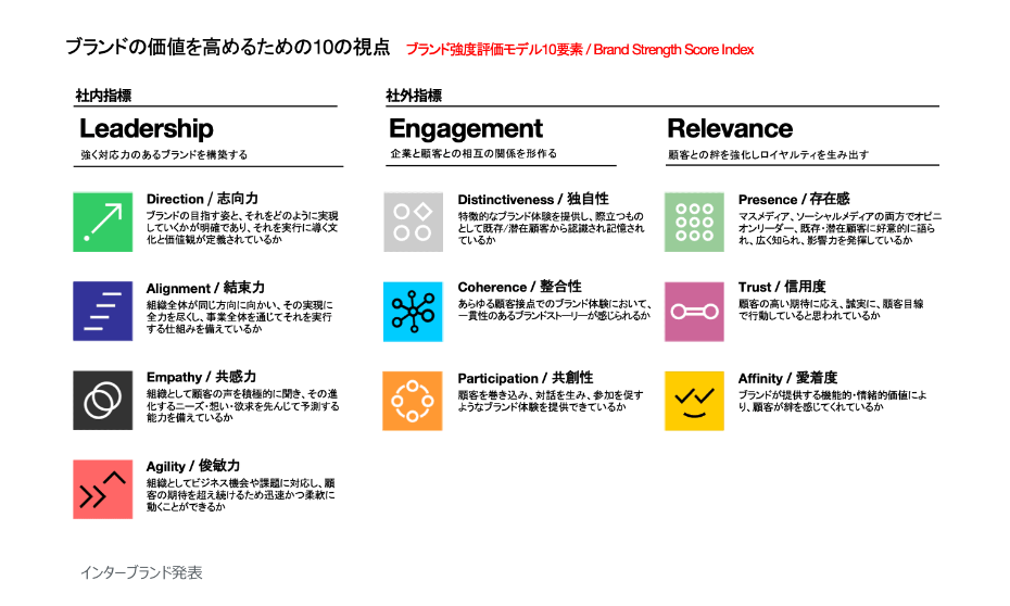 上條:インターブランドは、「ブランド力分析」の指標として「ブランド強度評価モデル10の要素」を提言しています。志向力、結束力、共感力、俊敏力、独自性、整合性、共創性、存在感、信用度、愛着度の10項目で、1項目10点の100点満点になります。ぜひ、これを参考に競合ブランドと比較しながら自社のブランド力をチェックしてみてください。