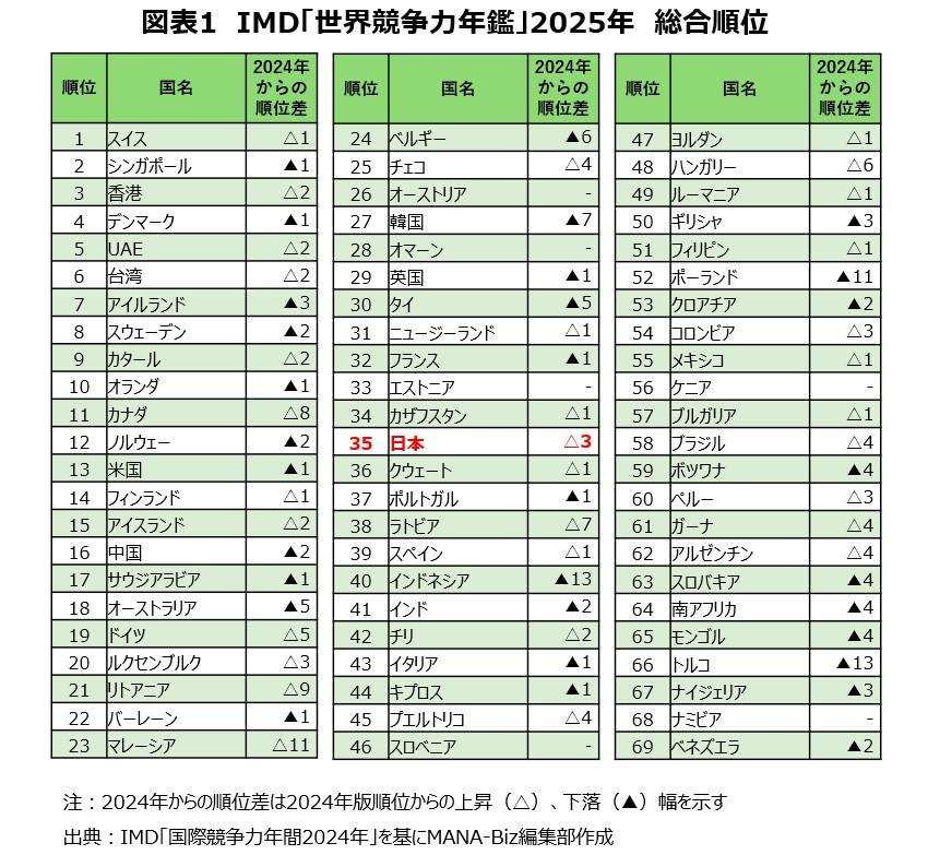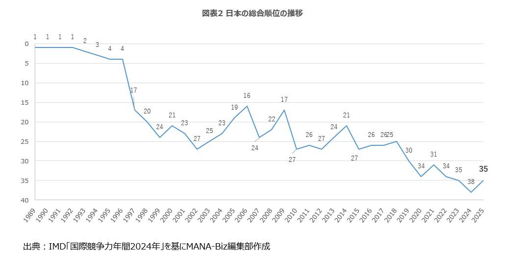 ひと言で言うと、いわゆる「失われた30年」です。今の若い世代には信じがたいことかもしれませんが、日本の国際競争力は、1989年から1992年は世界1位でした。そこから30年かけて落ちていき、2024年には38位まで転落しました。