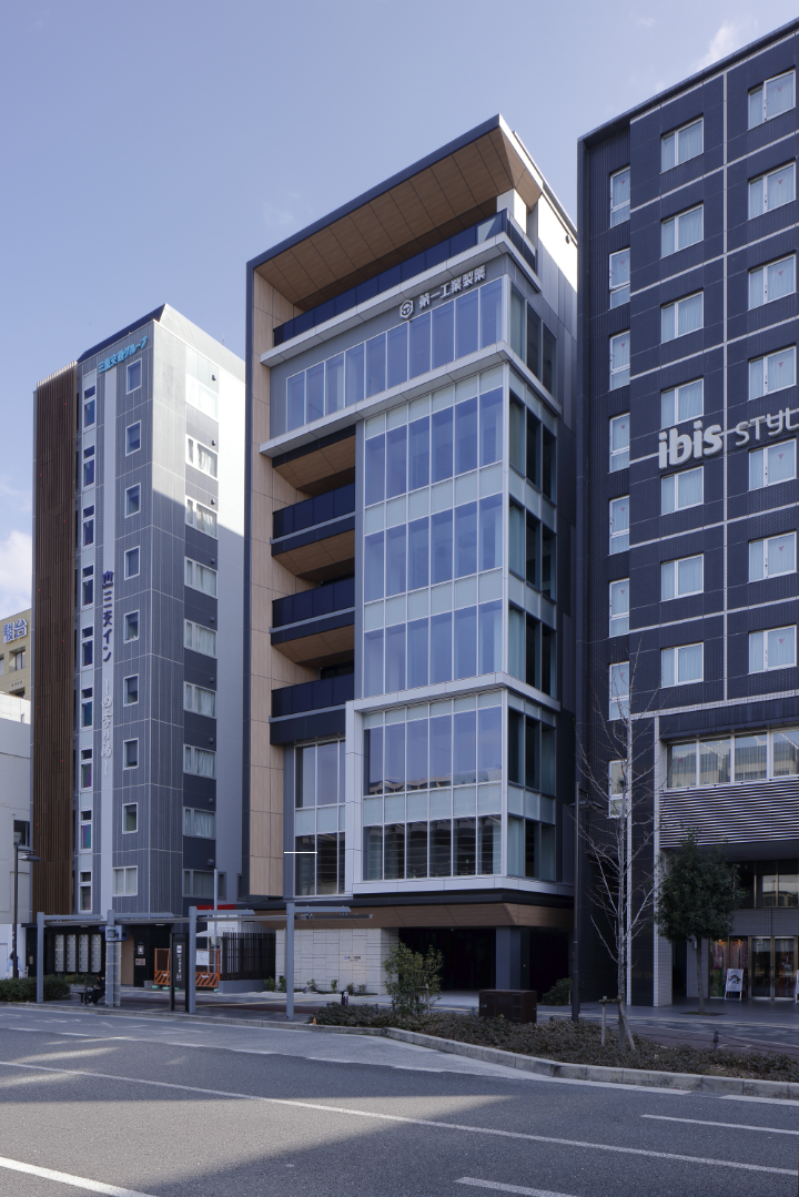 京都駅南口すぐのところにある第一工業製薬の本社オフィス。夜間には同社のイメージカラーであるブルーにライトアップし、認知症支援のオレンジ色などイベントや季節に応じて色味を変えているコンセプトは、顧客・社会・社員の 3つのU(=you)を結ぶオフィス