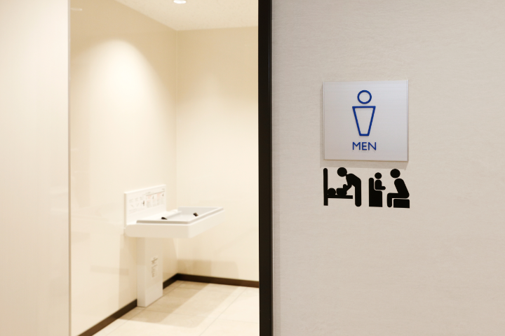 社外交流フロア1階のトイレ。多様性に配慮した「みんなのトイレ」やおむつ交換台や乳幼児と一緒に入れる個室のある男性トイレを設置している執務エリアにはフリーアドレスを導入。 経営陣の席もフラットに