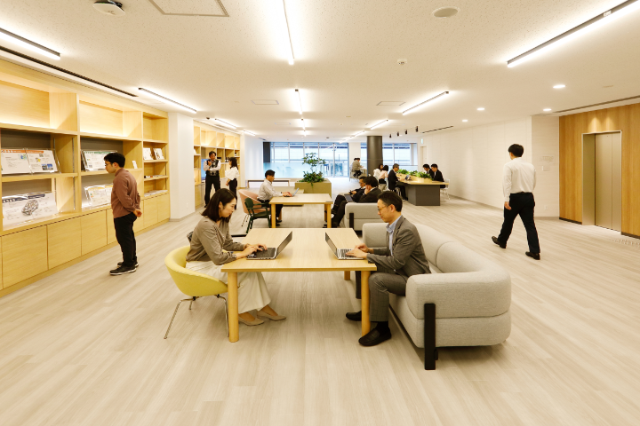 6階の執務スペース。新たにフリーアドレスを採用。社員は目的や気分に応じて思い思いの場所で仕事ができる
