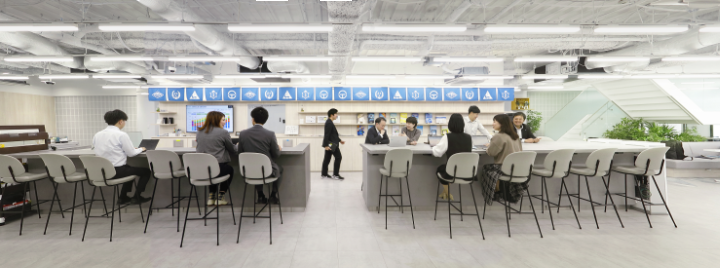松吉:新本社オフィスは、京都駅八条口(南側)を出てすぐの場所に位置する、8階建ての新築ビルです。1〜3階が社外交流フロア、4〜7階が執務フロア、8階が会議室フロアという構成になっています。 顧客や地域、社会との共創をコンセプトとした「社外交流フロア」は、吹き抜けになったオープンな空間です。1階には、巨大サイネージにより約3分間で各階の様子をドローン映像を通じて知ることが出来ます。また、誰でも使える「みんなのトイレ」を設置。男性トイレにもおむつ交換台やベビーチェアを設置するなど、多様性に配慮した仕様となっています。