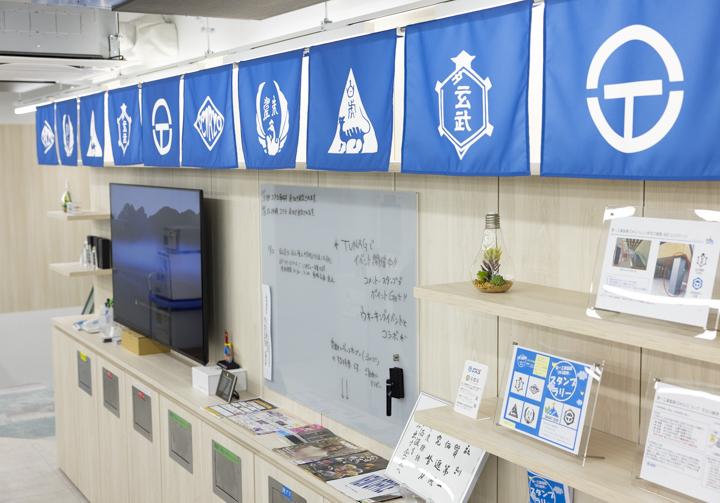 キッチンカウンターの奥に飾られた暖簾。社員が会社の歴史を思い返すきっかけになるよう、創業当時の四神をモチーフにした商品ロゴを使用している