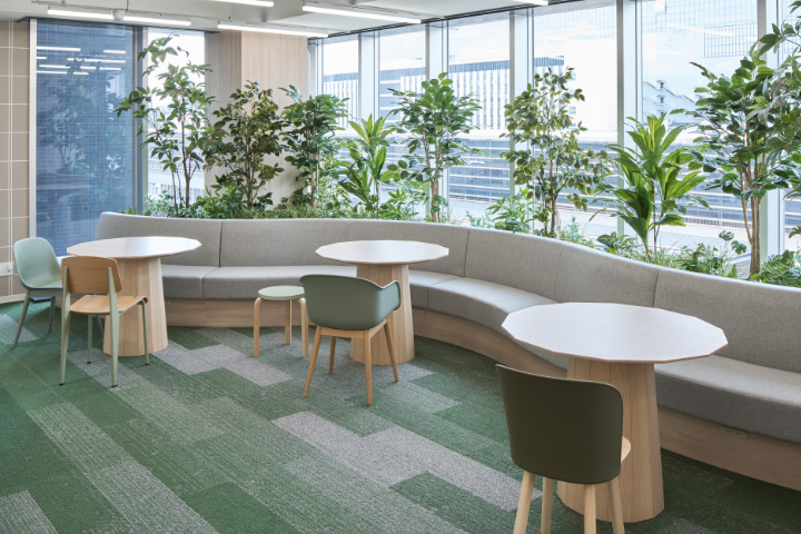 室内にはグリーンを取り入れ、明るくオープンな雰囲気の執務エリア(6階)。家具も明るく温かみのある色合いのものを選定