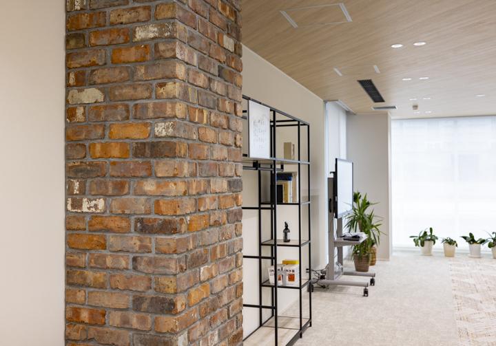 さらに、7階のフロアの一角には、壁面にレンガ柱を設置。これには「臥薪嘗胆(がしんしょうたん)※」の特別な思いが込められているのです。というのは、業績悪化のため2000年に京都工場を閉鎖した際に、工場の象徴である煙突のレンガを当時の経営者が一つ持ち帰って復活を誓い、保管していたという逸話があります。その時の悔しさを忘れず、さらなる企業成長をめざすという思いを社員と共有するべく、レンガ柱を作りました。