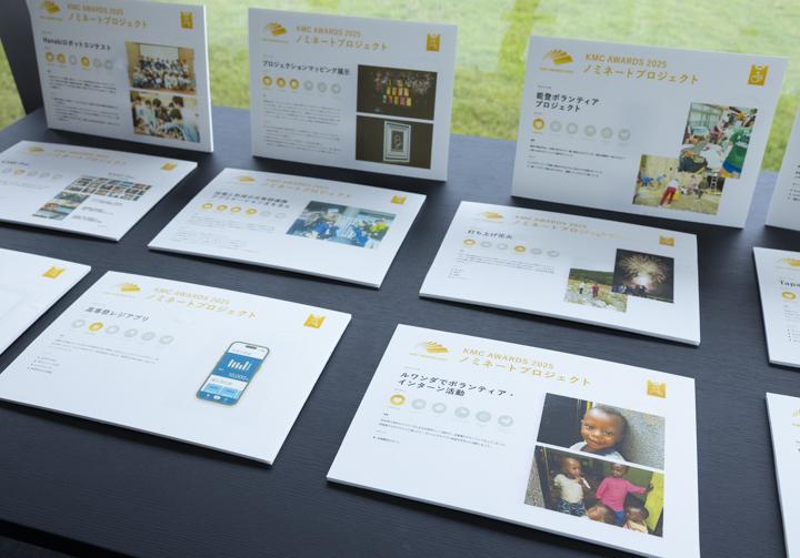 学生は個人もしくはグループでプロジェクトを立ち上げ、グラフィックデザイン、アプリ開発、ロボコン、災害ボランティア活動などに取り組む。写真は、こうした活動を応援する「KMC AWARDS 2025」にエントリーしたプロジェクトの紹介パネル。学生やスタッフの投票により選ばれたファイナリストたちがピッチを行い、起業家講師からフィードバックを受ける