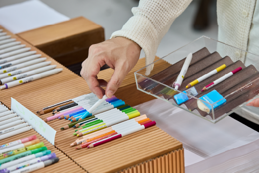 ステーショナリースタンドから、好きな文具を手に取って、さまざまな表現を楽しむことができる。