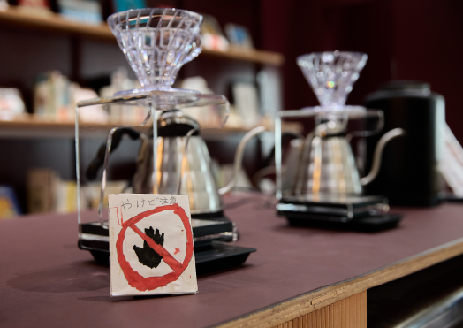 jiyugaoka roasteryのコーヒー豆を購入し、香りを楽しみながらハンドドリップができるカフェエリア。手前の注意書きは、o-i STUDIOに遊びにいらしたお子様の手作り。